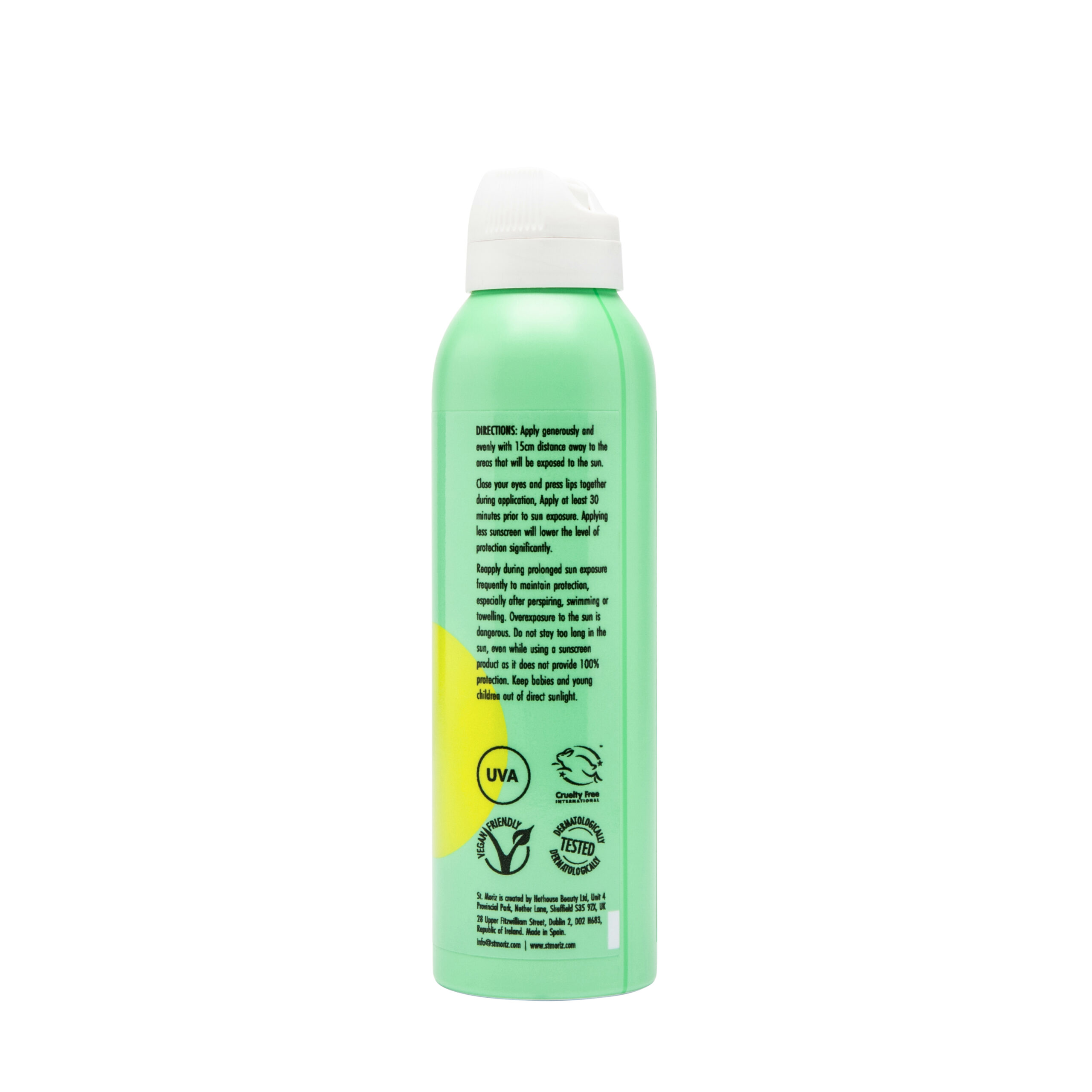 Spray do opalania do ciała St. Moriz Suncare to delikatna, niewidoczna mgiełka przeciwsłoneczna, zapewniająca ochronę przed promieniowaniem UVA i UVB. Został opracowany, aby chronić skórę przed długotrwałymi uszkodzeniami oraz przedwczesnym starzeniem się spowodowanym działaniem słońca. Jest wodoodporny, szybko wysycha i nie pozostawia białych śladów. Przetestowany dermatologicznie, nietestowany na zwierzętach i odpowiedni dla wegan.